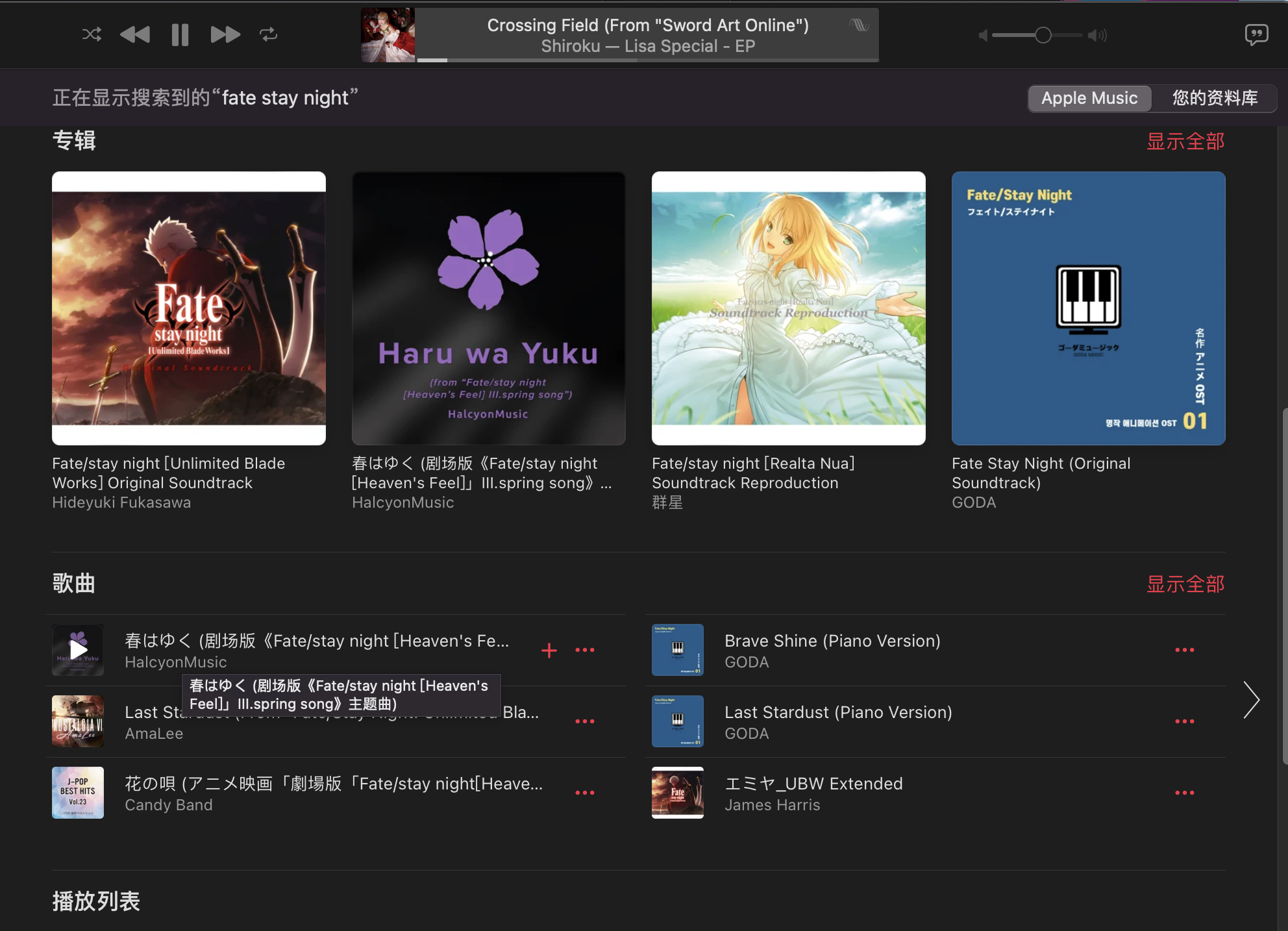 Fate厨如果想在Apple Music收听原声带的话估计也要失望了。FSN剧场版是一个都没有。不过梶浦由记的专辑也是收录的很少。FGO的收录倒是蛮全的。搜索过程中发现有的公司似乎在专门做这种未收录曲的钢琴版纯音乐,由于MIDI感过于明显让人不禁怀疑是批量制作然后进行一个烂的恰。
