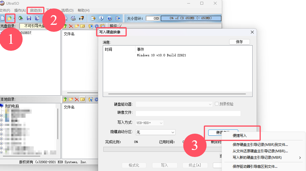 软碟通UltraISO的使用方法很简单:打开ISO、写入硬盘映像、便携启动(写入引导)