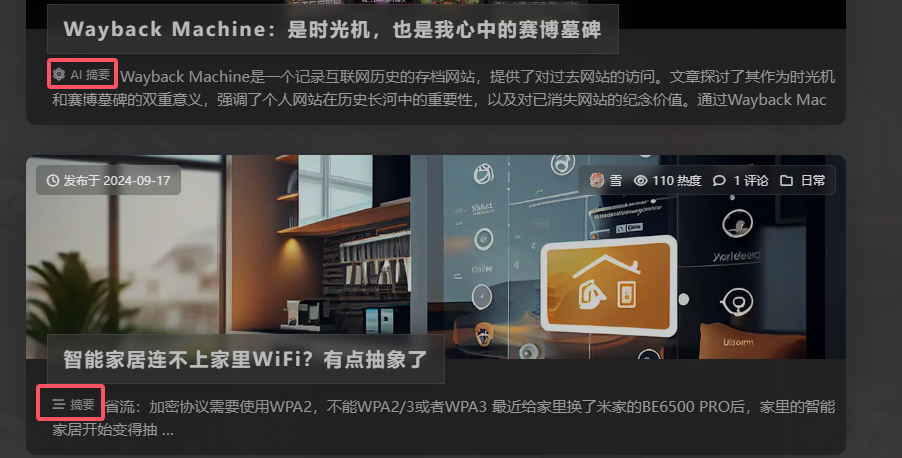 本站使用最久的主题IRO更新了,至于更新了什么,经常关注本站的小伙伴肯定已经发现了首页的卡片样式有了显著的变化,然后就是部分文章已经配上了AI摘要。AI摘要这个功能算是半自动的,开启后还要重新保存文章才能生成,考虑到有些AI的token不便宜如果文章多一点一次性全生成的话钱包又要流泪了。