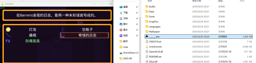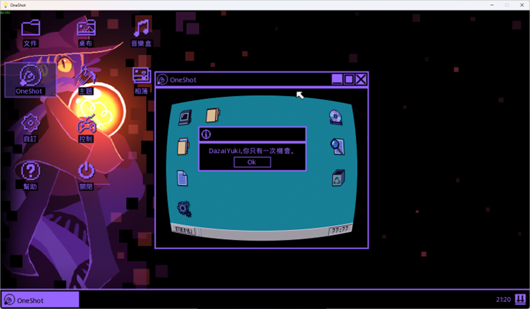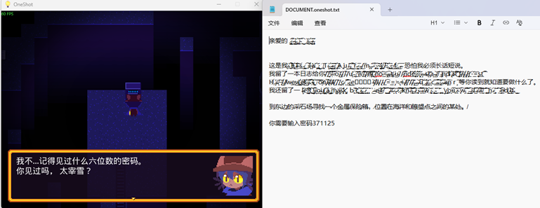 然而,真正让《OneShot》与众不同的是其外层——一系列突破第四面墙的元谜题。游戏会主动引导玩家跳出游戏窗口,在自己的计算机操作系统层面寻找解谜线索。例如,一个谜题的密码可能隐藏在游戏安装目录下的某个文本文档中;另一个谜题则可能需要玩家更改自己的桌面壁纸来获得提示 。为了促成这种独特的交互,游戏建议玩家使用窗口模式运行,和我们大部分游戏追求的“全屏游戏”的沉浸体验不同,这本身就是一种对传统“沉浸式”游戏体验的颠覆,它的这一表达方式也和其他的元叙事游戏有截然不同的体验流程。