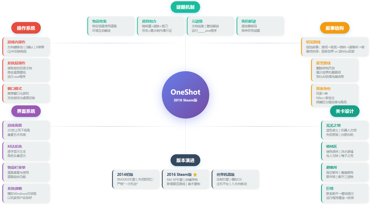 - 2014年初版:此版本更严格地遵循了“OneShot”(一次机会)的标题含义。游戏流程具有非常高的惩罚性,且保留了一些RPG Maker引擎遗留的、与核心玩法无关的RPG元素,如角色属性值等 。这种设计虽然新颖,但也给玩家带来了巨大的压力和不便。